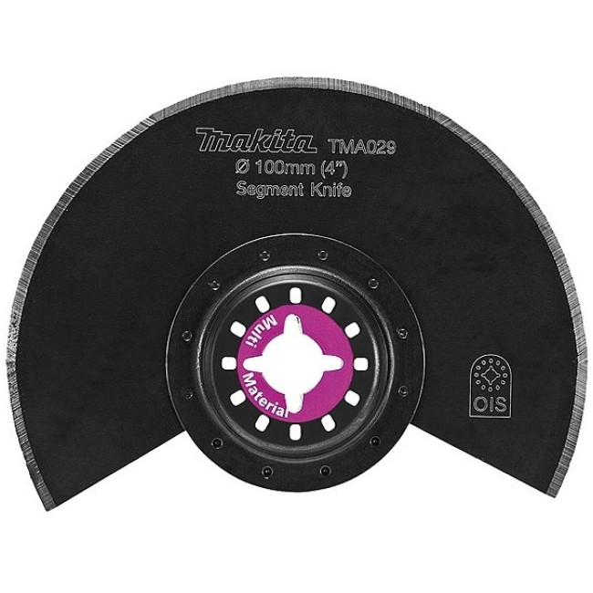 Сегментированный дисковый нож, 100 мм, 1 шт Bi-Metal TMA029 Makita B-34827 — насадка предназначенная для мультифункционального осциллирующего электроинструмента с типом крепления OIS. Подходит к сетевым и аккумуляторным моделям инструмента Makita TM30D, TM3000C, BTM40, BTM50, DTM40, DTM41, DTM50, DTM51 и аналогичных моделей. Пильный диск TMA029 Makita, предназначен для резки линолеума, ковров и резиновых материалов. Биметаллический дисковый резак ТМА029 Макита В-34827, весит 30 грамм, а его ширина составляет 100 мм.