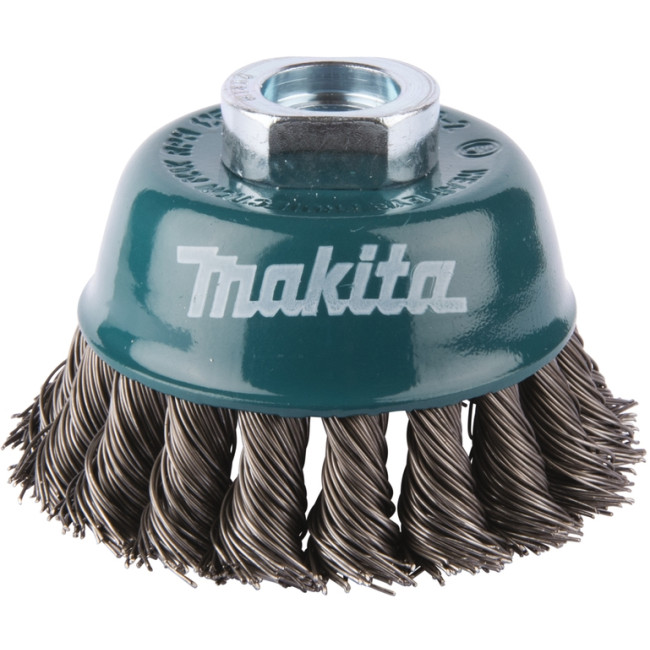 Чашечная щетка Makita D-24131, предназначена для угловых шлифовальных машин Макита. Ее рабочая часть представляет собой пучки витой проволоки, с помощью которой осуществляют шлифование, матирование, полирование, удаление ржавчины и заусенцев с поверхностей. Диаметр проволоки 0,5 мм.