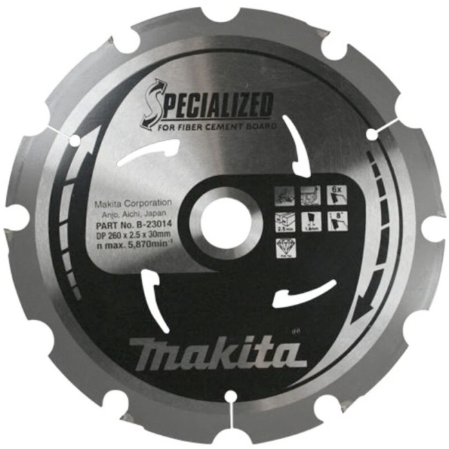 Пильный диск для цементноволокнистых плит, 260x30x1.8x6T, Makita B-23014. Специальная форма зуба (FTG) отлично подходит для прямого реза. Эта форма устойчива к сколам и обеспечивает ровный рез. Серия для цементноволокнистых плит - в состав напаек включены искусственные алмазы для увеличения срока службы. Специальная форма зубов и режущей поверхности диска увеличивают его производительность и износостойкость. Вентиляционные отверстия улучшают охлаждение диска, продлевая срок службы.