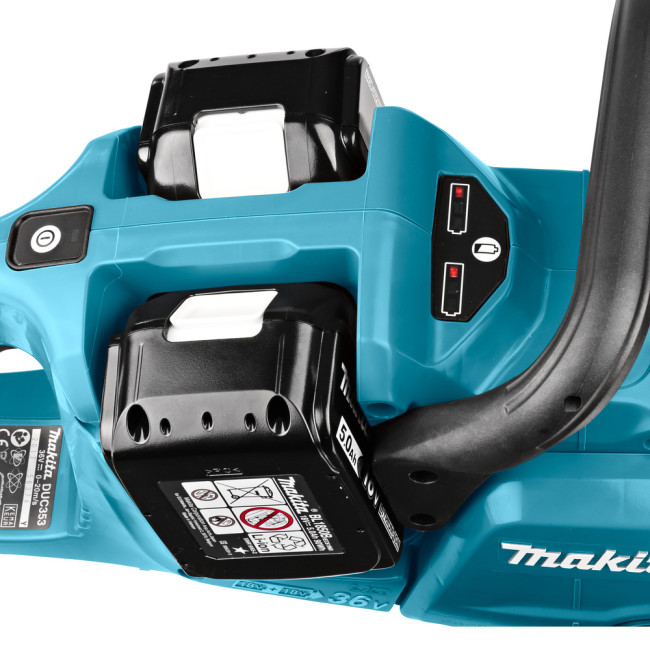 Возможность использования в цепной пиле привода с аккумуляторным питанием раньше была ограничена из-за недостаточной энергоемкости блоков. В агрегате Makita DUC353ZA2 эта проблема решена за счет установки двух литиево-ионных аккумуляторов напряжением 18 В. Производитель декларирует, что мощность этой пилы с длиной шины 35 см эквивалентна бензиновому аналогу с шиной 30 см. При этом описываемый аккумуляторный инструмент обладает теми же возможностями, что бензопила, но работать с ним его гораздо комфортней.