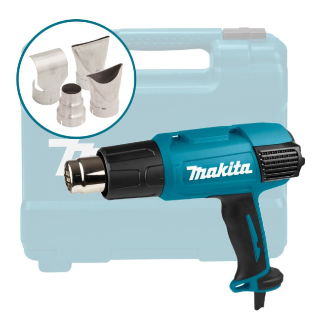 Термопистолет Makita HG6031VK - это инструмент, сконструированный для термической обработки различных поверхностей. Пистолетная форма, мягкие накладки на рукоятке служат для комфортной работы оператора. Длина шнура 2 м. Температура воздуха: 250 л/мин - 50 - 450 град; 500 л/мин - 100 - 600 град