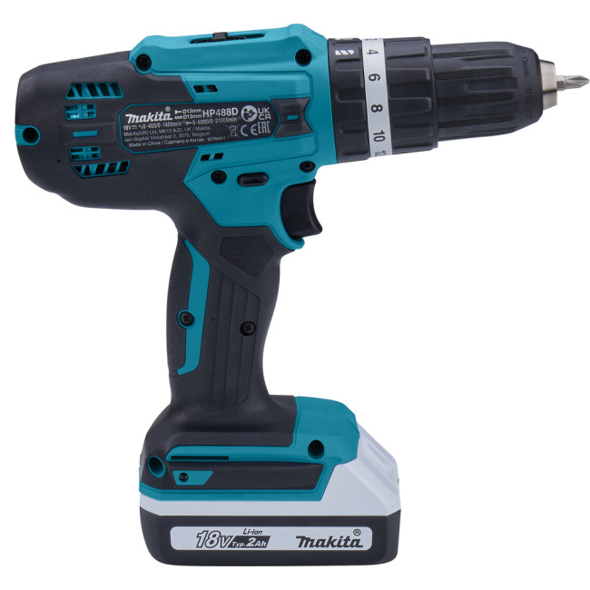 - Чемодан - для удобства хранения и транспортировки аккумуляторной дрели-шуруповерт Makita HP488DWE.