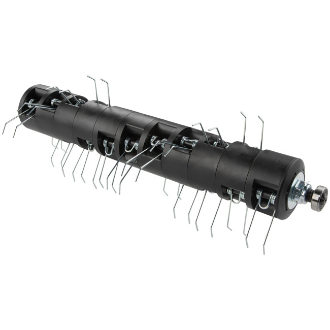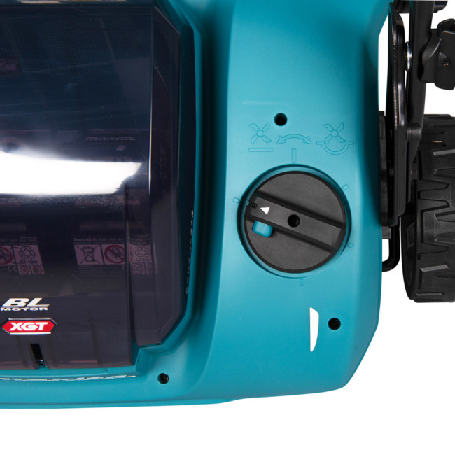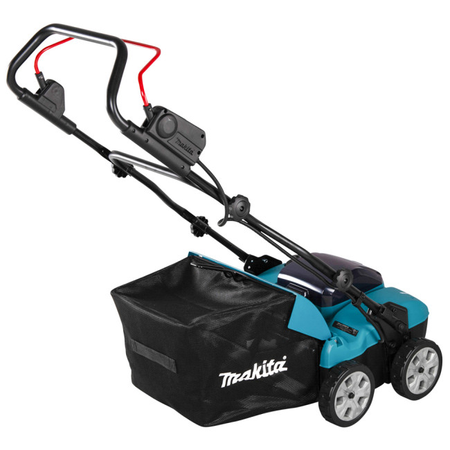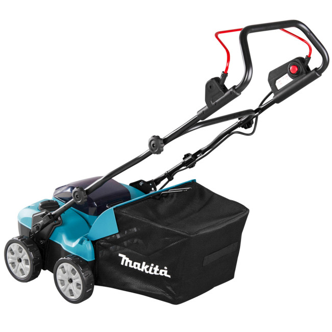 Первый скарификатор Makita UV001GZ на аккумуляторе шириной 38 см. Для ухода за газонами площадью до 500 м². Глубину обработки можно регулировать в 18 положениях от 5 до -12 мм. Работает от одной батареи 40 В, но при установке двух батарей автоматически переключается на вторую батарею для увеличения времени работы. Большой мешок для сбора травы имеет емкость 50 литров. Благодаря большим колесам диаметром 180 мм он имеет хорошее сцепление даже со скользкой поверхностью.