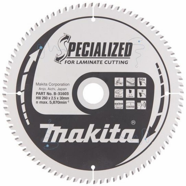 Диск Макита (аналог: В-29496) В-31603 предназначен для резки ламината, обладает длительным сроком службы и отличной производительностью. Благодаря трапециевидной форме зубов типа TCG, диск при резке не оставляет зазубрин, а специальное покрытие уменьшает образование коррозии и трения для предотвращения нагрева лезвия. Звукоизоляционные и антивибрационные слоты заполнены смолой. Купить товар - Диск пильный для ламината, 260x2.5x30 мм, 84T, 5G, TCG Makita B-31603 (аналог: B-29496), по выгодной цене очень просто, достаточно положить товар в «корзину» и оформить заказ или позвонить нам по телефону, так же можно для Вашего удобства, отправить заявку на Е-майл.