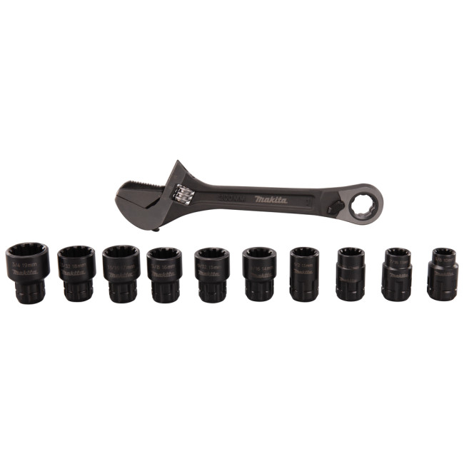 Для крепления гаек и болтов. Функция храпового механизма подходит для системы 6-GL. Набор состоит из разводного гаечного ключа 200 мм и головок 3/8 дюйма на 10, 11, 12, 13, 14, 15, 16, 17, 18 и 19 мм. Головки подходят для шестигранных, двенадцатигранных, квадратных, шлицевых и круглых шестиугольных гаек.