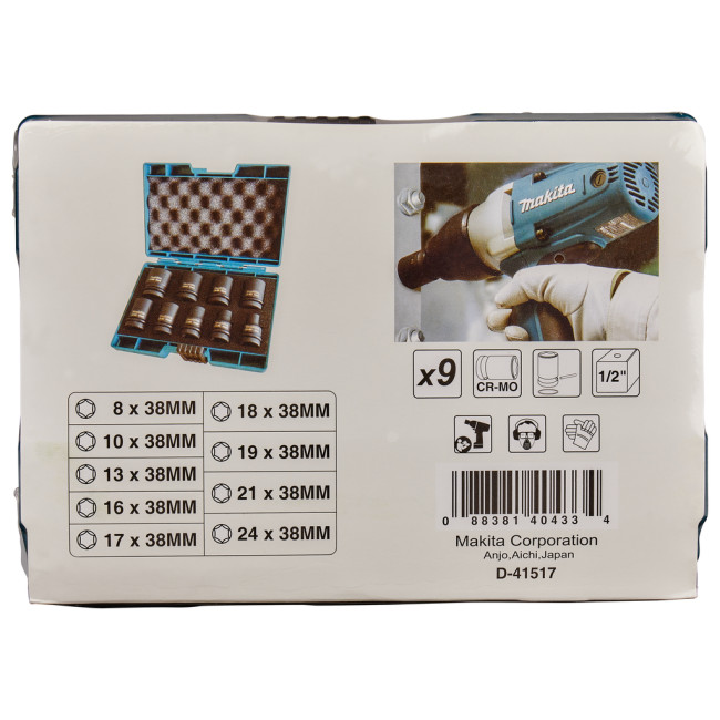 Набор торцевых головок (9 шт; 1/2") D-41517 Makita используется при проведении слесарных и монтажных работ в мастерских и на производствах. торцевые головки предназначены для работы с инструментом ударного действия. Для удобства хранения и транспортировки прилагается пластиковый кейс. В набор входят 9 торцевых головок: 8, 10, 13, 16, 17, 18, 19, 21, 24 мм. Купить товар - Набор ударных торцевых головок 1/2" (8, 10, 13, 16, 17, 18, 19, 21, 24 мм) 9 шт Makita D-41517 для гайковерта очень просто, достаточно положить товар в «корзину» и оформить заказ или позвонить нам по телефону, так же можно для Вашего удобства, отправить заявку на Е-майл.