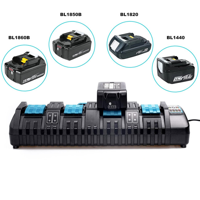 Зарядное устройство для четырех аккумуляторов LXT® 14,4 В и 18 В со слайдерным механизмом. Имеет охлаждающий вентилятор, который охлаждает аккумулятор для ускорения зарядки. Зарядка оптимизирована с точки зрения напряжения, силы тока и температуры. Заряжает по две батареи одновременно; зарядка четырех батарей 5,0 А·ч занимает 220 минут.