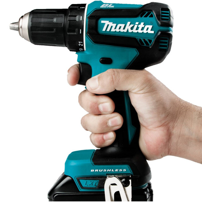 Дрель-шуруповерт Makita DDF485RTJ представляет собой надежное удобное устройство, которое пользуется большой популярностью среди мастеров. Оно позволяет быстро и без всяких лишних хлопот производить работы по закручиванию крепежа и по созданию отверстий в различных материалах. Благодаря небольшим размерам данный инструмент можно применять в местах с затрудненным доступом. Диаметр сверления для стали у предлагаемой техники имеет величину 13 мм, а для дерева 38 мм. Функционирует она от Li-ion батарей напряжением 18 В.