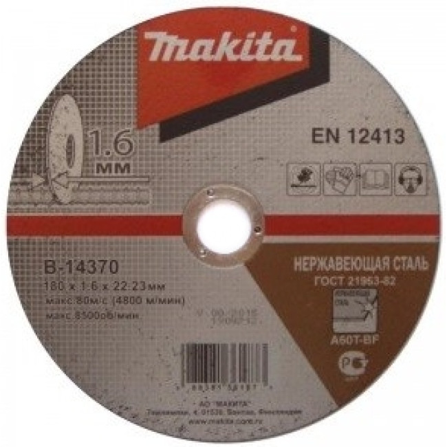 Абразивный отрезной диск для нержавеющей стали плоский A60T, 180х1,6х22,23 мм Makita B-14370 можно купить через корзину нашего магазина или заказать по телефону. Будем рады видеть Вас в нашем фирменном магазине на Машиностроителей 29.