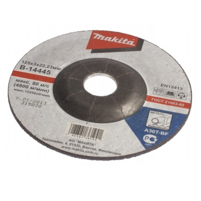 Отрезной диск c вогнутым центром Makita для работы с металлом. Диаметр 125 мм. Посадочное отверстие 22.23 мм.