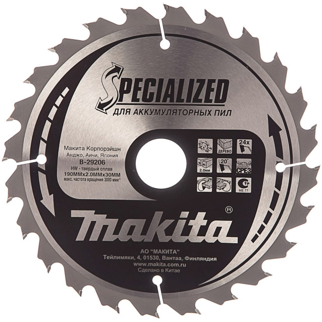 Пильный диск по дереву 190x2.0x30 мм, 24T, ATAF для аккумуляторных и сетевых пил DHS710, HS7100, HS7601 Makita B-29206 (аналог: A-87258), является оптимальным вариантом для проведения качественной резки дерева. Изготовленный из высокопрочных материалов диск обладает непревзойденной износостойкостью и долговечностью. Оптимальный диаметр диска позволяет использовать его наиболее эффективно. В качестве дополнительного плюса можно отметить тот факт, что диск можно легко установить в инструмент. Купить пильный диск по дереву для аккумуляторных пил Макита B-29206, очень просто, достаточно положить товар в «корзину» и оформить заказ или позвонить нам по телефону, так же можно для Вашего удобства, отправить заявку на Е-майл.