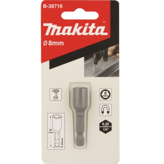 Магнитная торцевая головка Makita B-38716 для выполнения монтажных и демонтажных работ. Хвостовик шестигранник 1/4" дюйма, длина 50 мм.