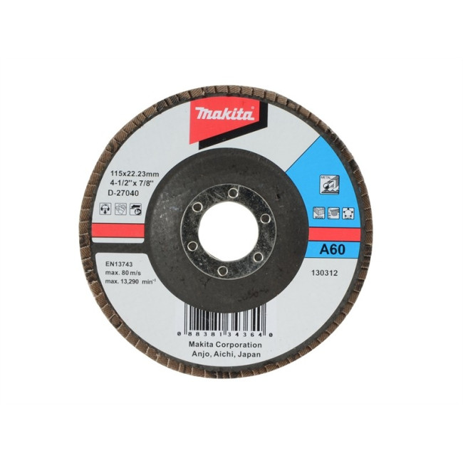 Лепестковый шлифовальный диск Makita для обработки стали, цветных металлов, пластика и дерева. Диаметр 115 мм.К80. Посадочное отверстие 22.23 мм.