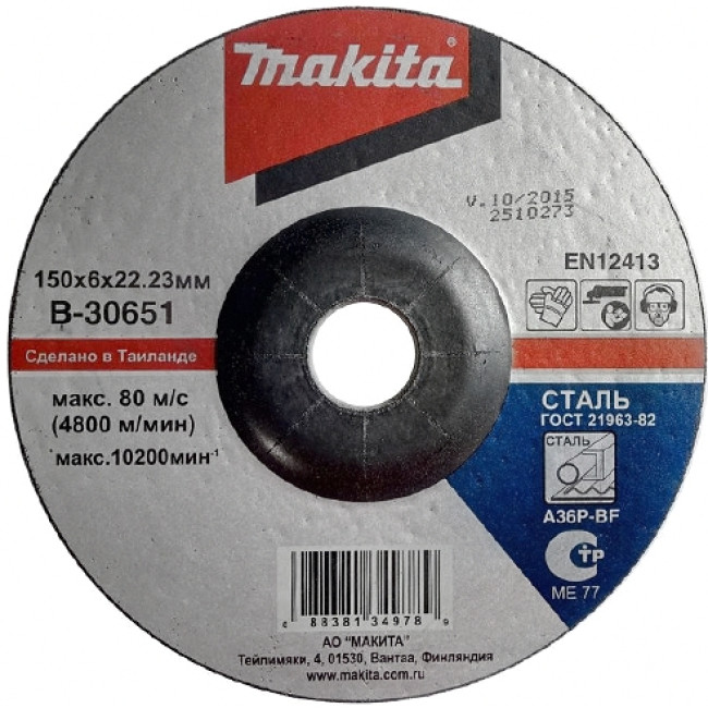Абразивный шлифовальный диск для стали с вогнутым центром A36P, 150х6х22,23 Makita B-30651 можно купить через корзину нашего магазина или заказать по телефону. Будем рады видеть Вас в нашем фирменном магазине на Машиностроителей 29.