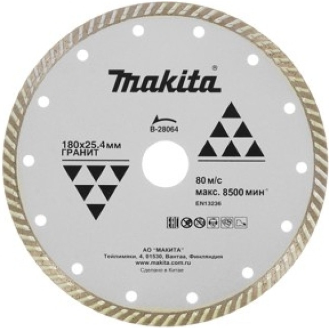 Диск алмазный сплошной рифленый применяется совместно с угловой шлифовальной машиной Макита для резки гранита и мрамора. Имеет турбированную режущую кромку, что увеличивает прочность и долговечность диска.Купить – Диск алмазный сплошной рифленый по граниту, 180x22.23 мм, сухая резка, Turbo Makita B-28064 (аналог: A-84078) для УШМ и SG180 очень просто, достаточно положить товар в «корзину» и оформить заказ или позвонить нам по телефону, так же можно для Вашего удобства, отправить заявку на Е-майл.