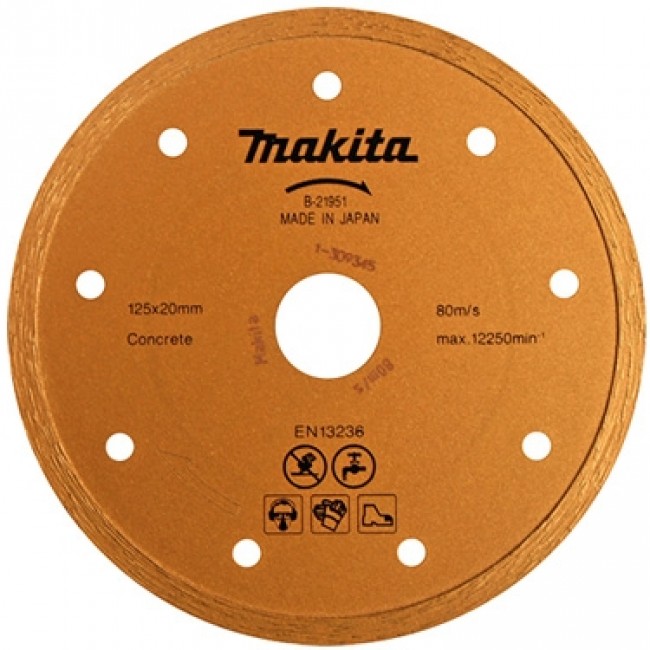Алмазный диск Макита B-21951 со сплошной однородной кромкой в 4 мм идеально подходит для мокрой резки керамической плитки, природного камня, гранита и мрамора. Данный диск также применяются для работ по кирпичу, бетону, асфальту, дорожным плитам. Алмазные диски выполнены из высококачественных материалов и имеют длительный срок службы. Купить - Диск алмазный по бетону, 125x20 мм, мокрая резка Makita B-21951, очень просто, достаточно положить товар в «корзину» и оформить заказ или позвонить нам по телефону, так же можно для Вашего удобства, отправить заявку на Е-майл.
